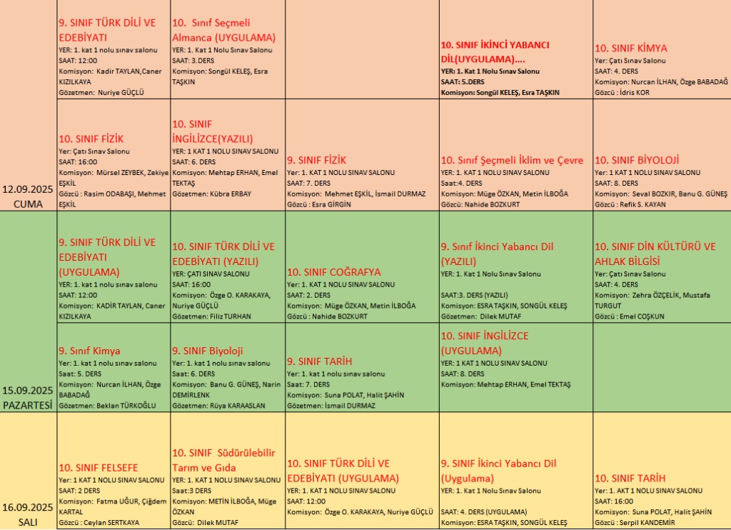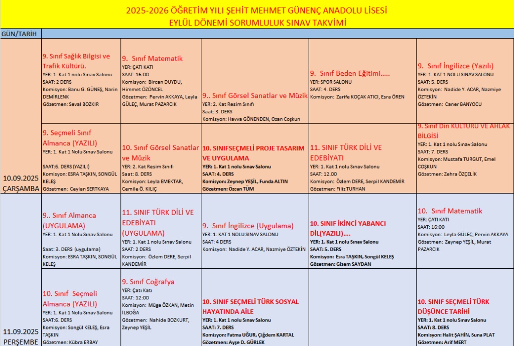 2025-2026 ÖĞRETİM YILI ŞEHİT MEHMET GÜNENÇ ANADOLU LİSESİ EYLÜL DÖNEMİ SORUMLULUK SINAV TAKVİMİ